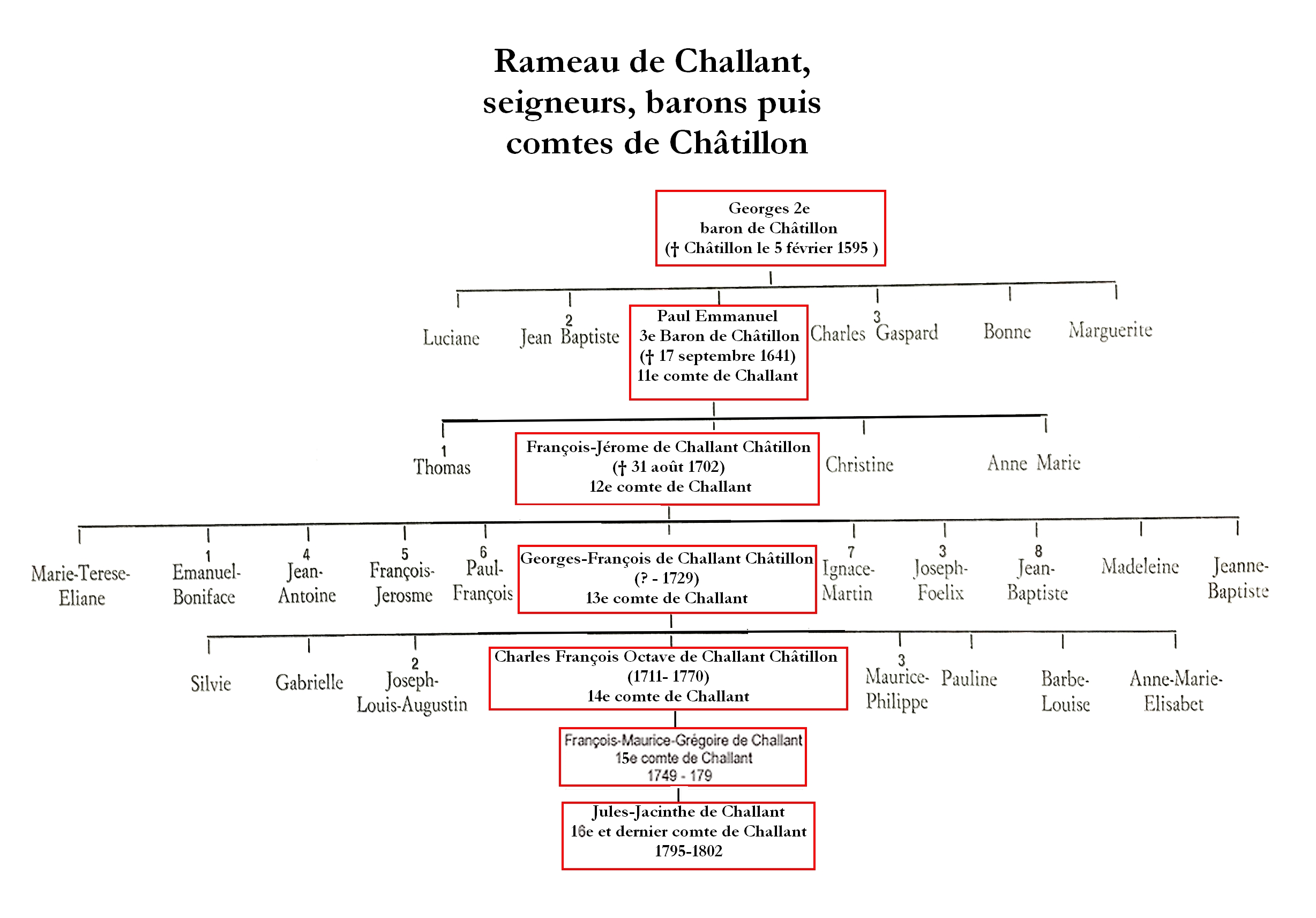 Si l'on fait un bilan "statistique" sur les Challant qui nous intéressent (ce bilan repose sur l'ouvrage de Pascal Durandard, Histoire généalogique de la Maison de Challant, Centre Généalogique de Savoie, Annecy-le-Vieux, 2019) : il y a 350 Challant en tout, partagés en 9 branches, chacune représentant entre 6% et 22% de l'effectif familial total. Le château de Châtillon a été tenu par 5 de ces neuf branches, changeant de mains au cours de l'histoire mouvementée de la famille. Parmi les Challant, 25 (7,1%) sont directement "de Châtillon", soit 19 "seigneurs de Châtillon", 6 "barons de Châtillon", et 4 "dames de Châtillon". Il s'agit la des "titulaires" de la seigneurie, même si les enfants de ces branches sont bien plus nombreux. Ils couvrent une période qui va de 1177 à 1795, même si les seigneurs de Châtillon de la deuxième moitié du XVIIIe siècle (François Maurice Grégoire et Jules Charles Maurice Hyacinthe de Challant) ne l'indiquent plus dans leur titulature, et insistent sur le comté de Challant, regagné après un long procès en 1696.