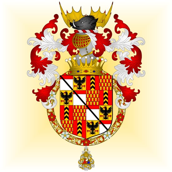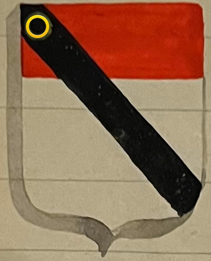 Armoiries de la famille Challant, peintes dans le décor en stucs du grand salon du château Passerin d'Entrèves et de Courmayeur à Châtillon.