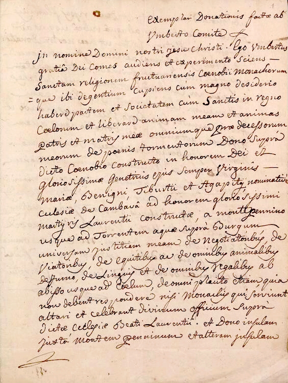 Copie de la donation faite en 1100 par le comte de Savoie, Humbert II, de l'église de Chambave, près de Châtillon, à l'abbaye de Fructuaire (San Benigno Canavese)(Archives d'Etat de Turin, Sezione Corte, Materie ecclesiastiche, Abbazie, Abbazia dei Santi Benigno e Tiburzio di San Benigno di Fruttuaria, Inventaire N° 134).