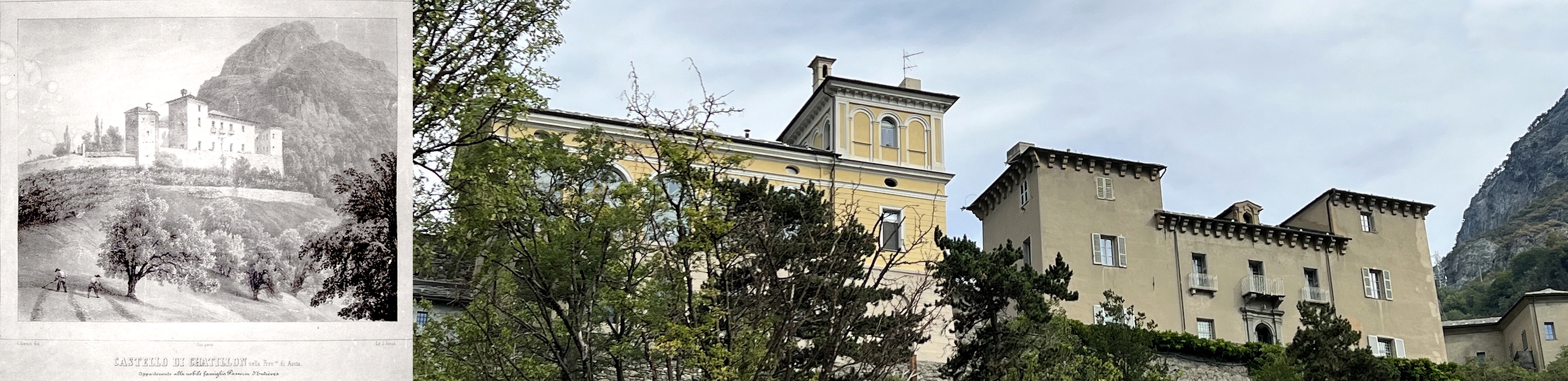 Enrico Gonin (1798-1870?), auteur de cette gravure, l'intitule "Château de Châtillon, dans la privince d'Aoste, appartenant à la noble famille Passerin d'Entrèves". Le château est donc représenté, probablement, entre 1841, date de mort de Gabriella de Cumiana, veuve de Challant, et remariée Passerin d'Entrèves, et donc de changement d'attribution de la propriété, et 1855, date de destruction de la tour hexagonale romaine, ici encore représentée sur la gauche du bâtiment (gravure de Enrico Gonin, collection privée).