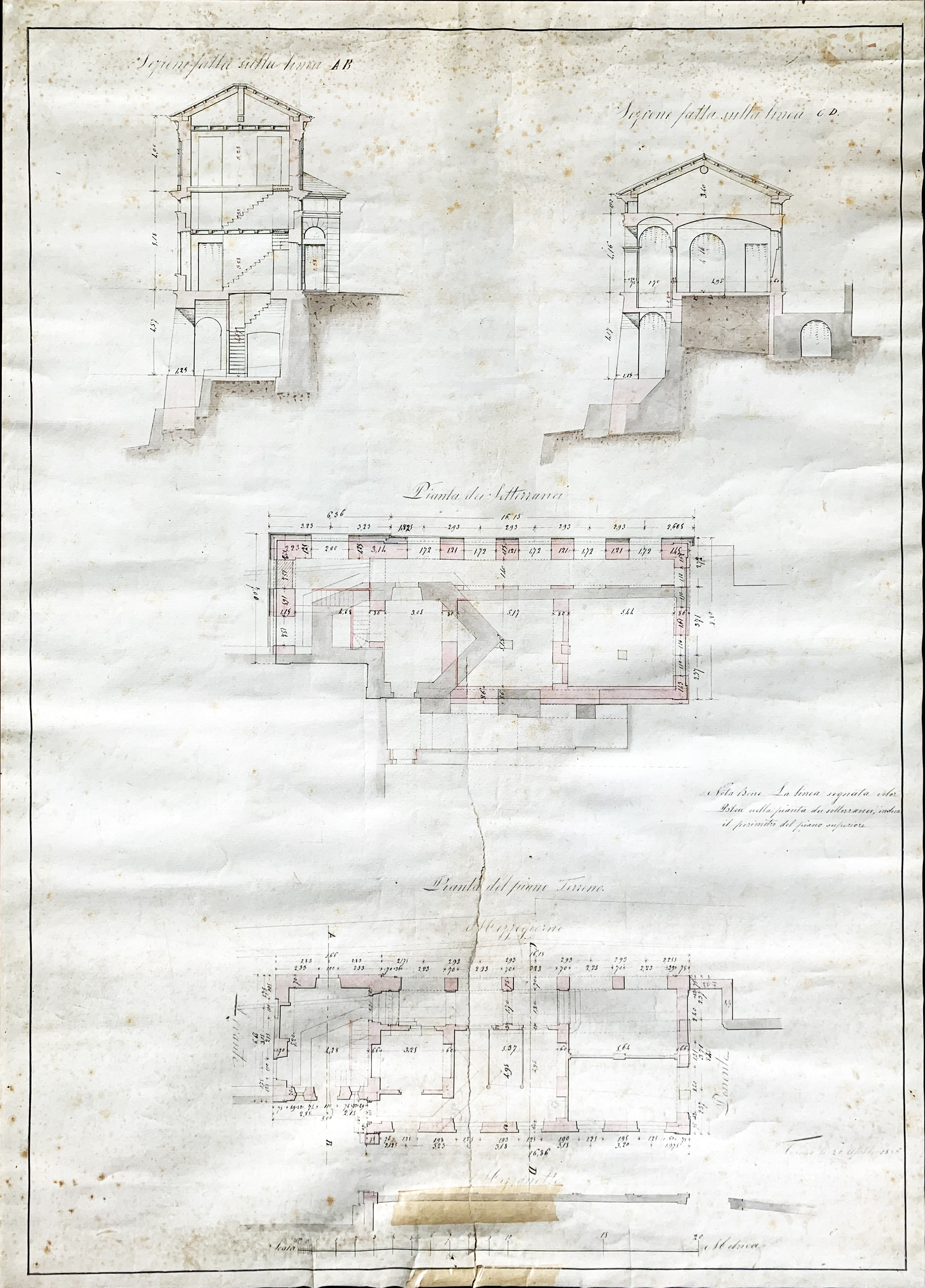 Plan de construction de la maison des gardiens d'avril 1856. On voit apparaître en grisé le dessin des fondations de la tour romaine au profil hexa- ou heptagonal irrégulier (collection privée).