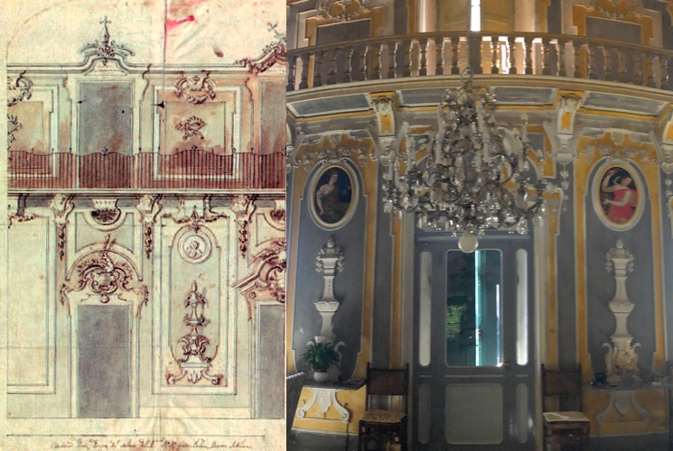 Image 1 : Dessin préparatoire pour le décor du Grand Salon du Château de Châtillon (Attribué à la Bottega De Giorgi, Alzato della decorazione per il salone a doppia altezza nel castello dei nobili Challant a Châtillon, Valle d’Aosta, environ 1735-40, encre de chine sur aquarelle, sur papier, cm 39.7 x 29.3, Bellinzona, Archivio di Stato, fondo Rabaglio, tav. 9. Image 2 : Réalisation des stucs du Grand Salon, autour du portail d'accès (photo collection privée).