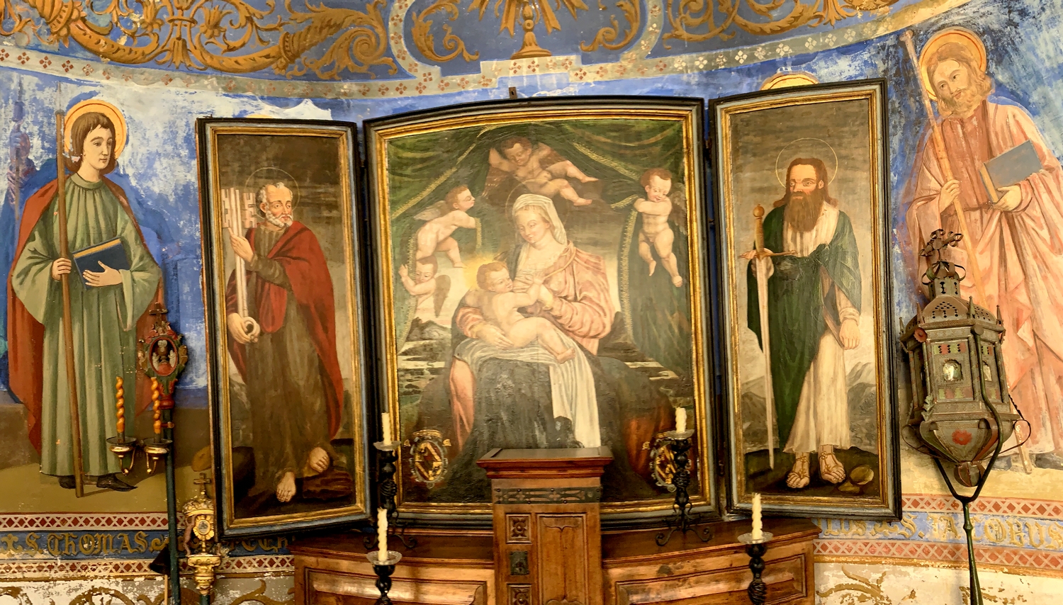 Triptyque daté d'après les armoiries du panneau central, celles du baron Georges de Challant Châtillon, en bas à gauche, marié en 1585 avec Adriana Costa della Trinità, armoiories en bas à droite. Comme il est mort en 1595, le tableau date de cette décennie, peut-être plus précisément de 1586, date de naissance de leur fils et héritier, Paul-Emmanuel, baron puis comte de Challant.