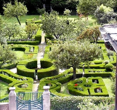 Ni jardin à la française (buis trop hauts, arbres fruitiers ou non, fleurs diverses, massifs de rosiers...), ni jardin à l'italienne (pas de sculptures, pas de haies hautes, pas de recherche d'utilisation du relief...), ce jardin est original dans sa forme comme dans les conditions, dures malgré tout, qu'il doit subir en hiver, par 550 m d'altitude, dans une des régions les plus froides d'Italie. En 1855, on démolit la tour octogonale romaine pour construire une orangerie, entre autres, où hivernaient encore il y à peu d'années citronniers et lauriers roses, qui ornaient les allées du jardin autant que l'esplanade autour du château. Mais l'orangerie restructurée en maison de gardiens, les plantes décoratives hivernent désormais dans les sous-sols du château. Quelques bancs agrémentent le jardin et l'esplanade autour du château. |