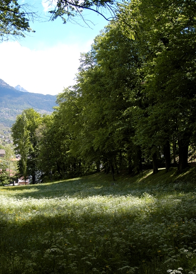 Château de Châtillon. Sentier près du jardin potager. Hêtre vert. Prairie centrale.